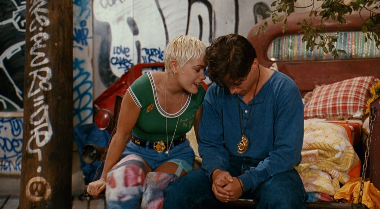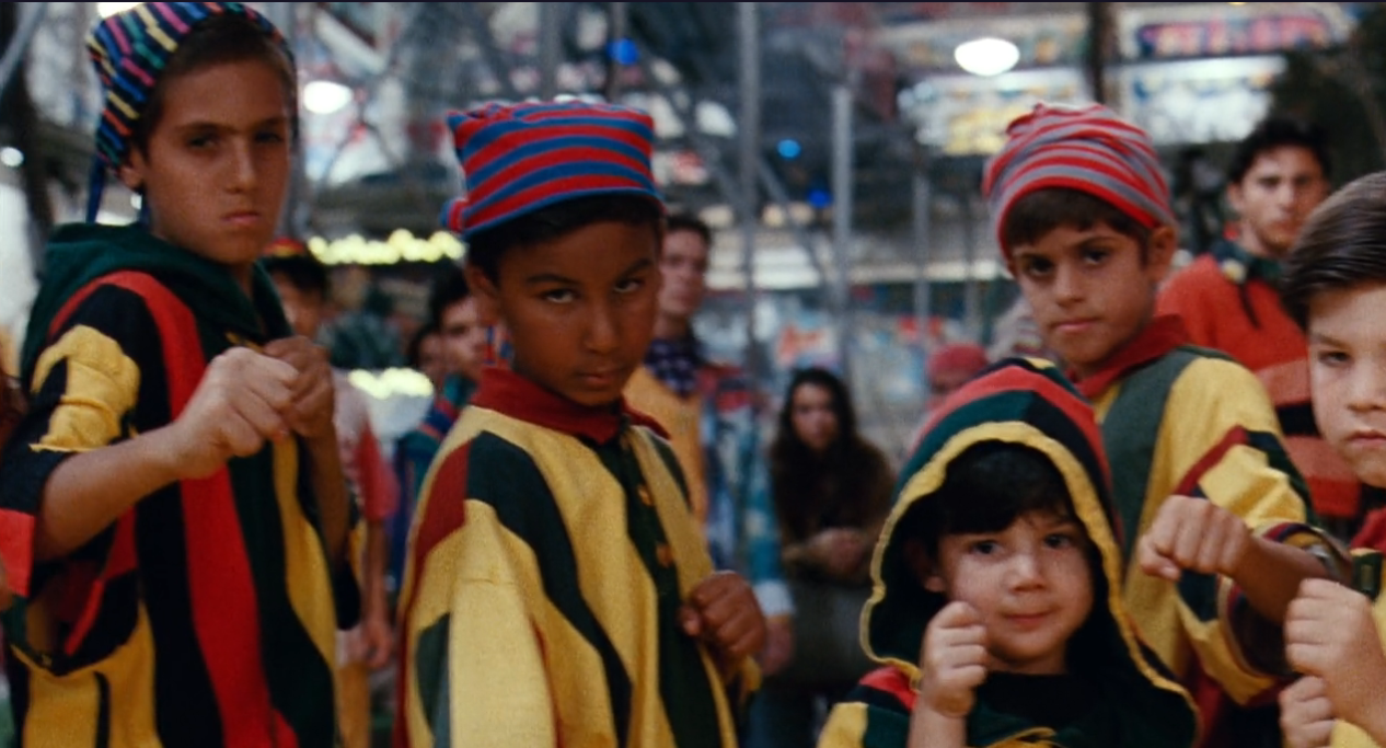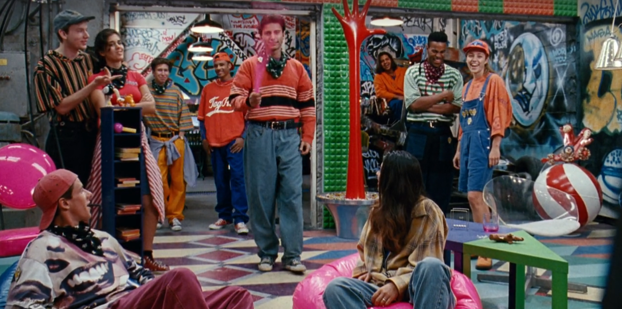 Barely emotionally affected, Billy and Jimmy wander about the city for a bit, then stumble (literally) into a quirky underground hideout: a psychedelic crayon-colored Nickelodeon Studios set. The denizens of this suspiciously over-decorated set are the Lost Boys of this movie, complete with their very own Wendy.