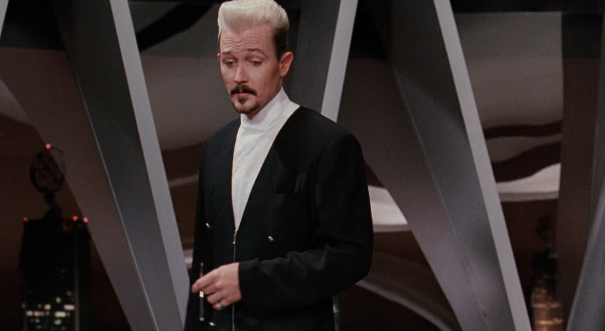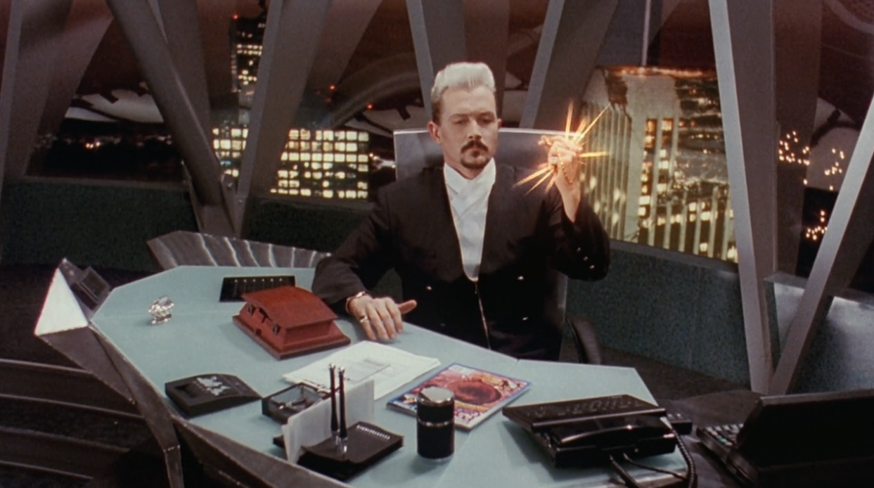I really appreciate the visual style we get in these scenes. Shuko and his minions are standing around in this dramatic architecture, all chrome and glass and sunglasses and cigarette smoke (of course he smokes with a cigarette holder, because he's eeeevil), and the camera rotates slowly around this set that's lit nice and flat and bright as if for TV. The production level in this movie is quite high. Too high!
