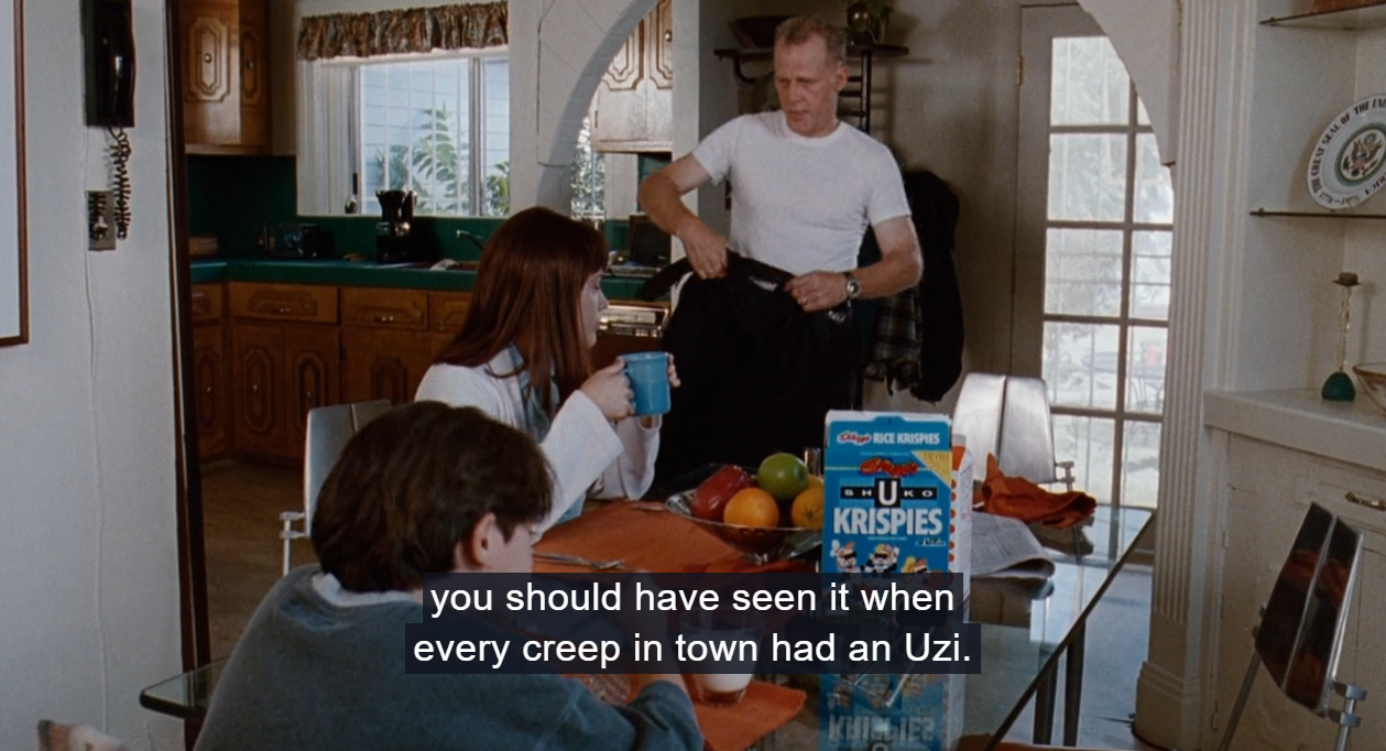 We are not exactly in "nowadays" (1993), but the frightening near-future of 2007. Los Angeles has been ravaged by a horrible earthquake and has become a total dystopian hellscape, with irregular and unreliable electric power, miserable brown skies and polluted air (oxygen vending machines are on the street, where you can pay to breathe. Get it?). This post-apocalyptic New Angeles is ruled over by the Shuko corporation, who has all the money and all the power and presumably most of the nice breathable air.