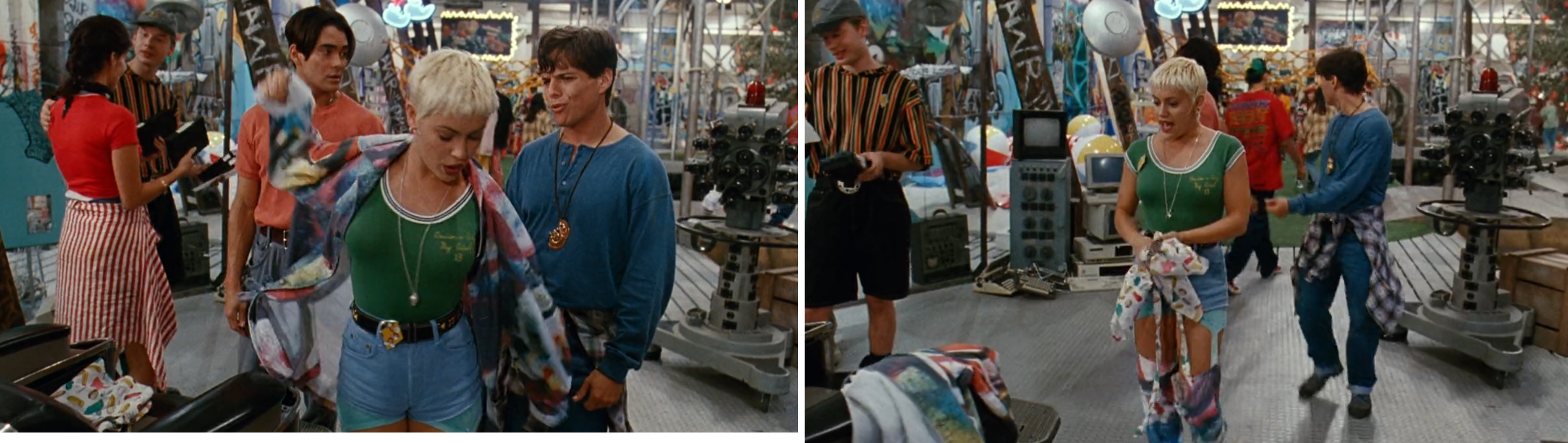 Marian's at-home look is gone now, her long brown wig shed to reveal an aggro Acid Burn bleached pixie cut, denim shorts with turquoise garters and a hell of a lot of spray-painted overclothing. Please take a moment to appreciate the high fashion shown above, because her outfit is goddamn amazing.