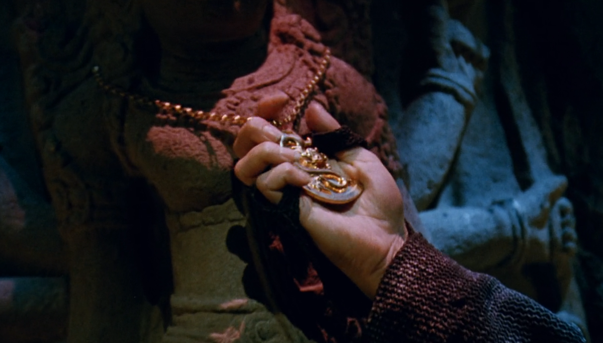 We cold-open with a fight "Somewhere in China" (love that for them) between ninja and monks, which ends up being a very one-sided slaughter. A ninja slithers into a candlelit cave and rips the dragon medallion from the neck of a beautiful Bodhisattva statue (luckily, the chain's clasp is made of paper, so it comes right off).
