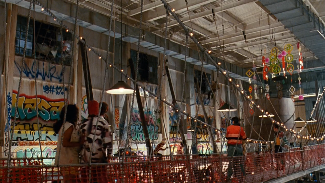 THIS is the Power Corp, the terrorists who fight the gang influence for the good of the community (apparently). Orphans of all ages live here, "the only safe place for them" since the city is so unsafe by night. Their leader is, naturally, the only girl we've met in the whole movie since Satori is now blown to shit: Marian!