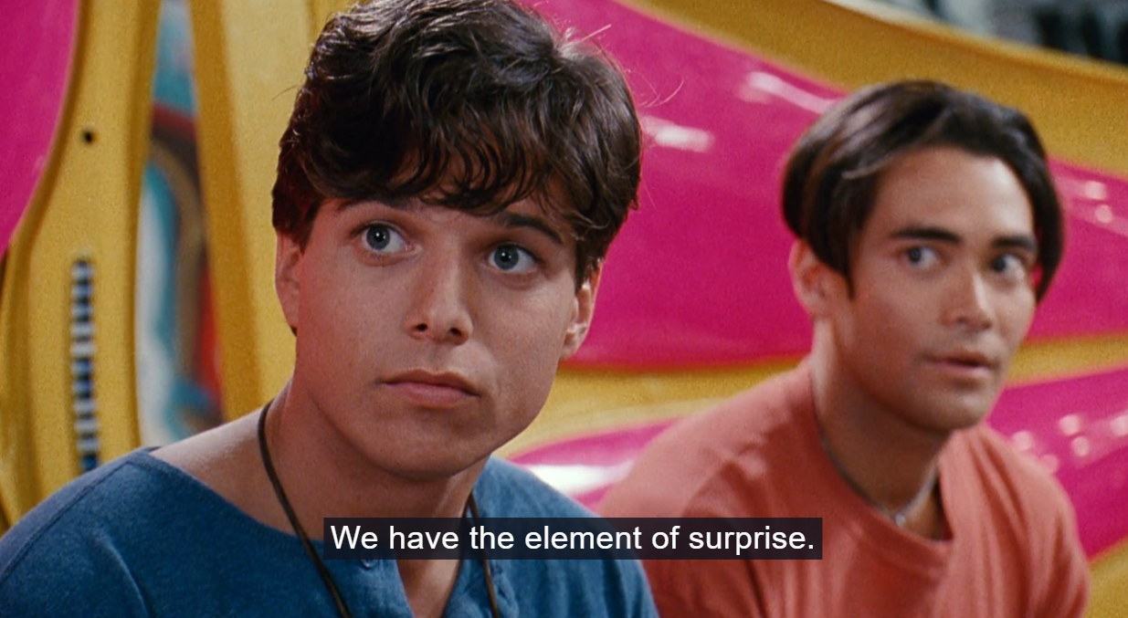 Although Dacascos was actually a martial artist when cast as Jimmy Lee, neither of these actors look like action heroes. The haircuts and styling (two-button t-shirts and jeans?) make them look even younger (Dacascos was 30 at time of filming; Wolf was 26). It seems that despite the somewhat serious stakes of an evil corporate tycoon, a bombed-to-shit LA and gang violence, this movie is actually supposed to be for kids. In 1994, everyone in America thought video games were for 8 year olds, after all.