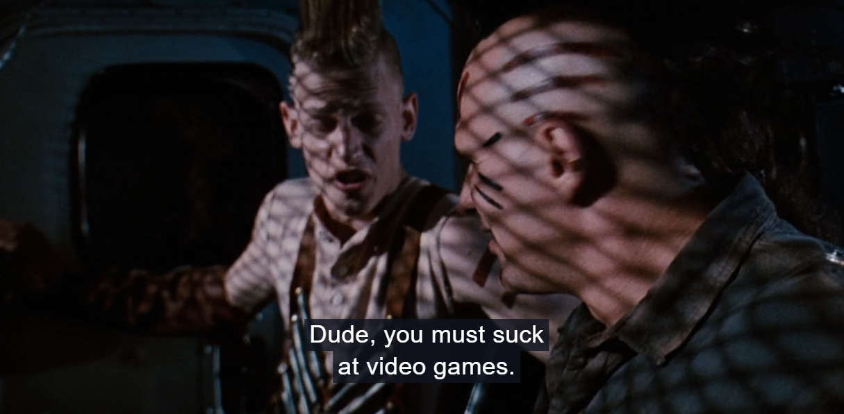 --and the gang members, who are all dressed to the nines in post-apocalyptic punk in the finest 80s and 90s manner, guffaw and hoot in their MAXIMUM OVERDRIVE truck while trying to crush the Lee brothers. We even get a sample of the movie's sense of humor in this fourth-wall-breaking line: