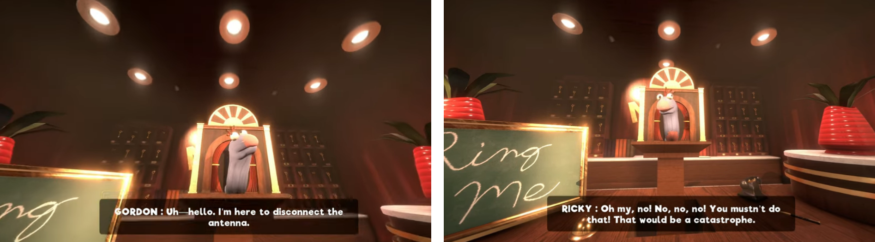 When he arrives, however, at the trash-filled and gritty parking lot in front of the City Network Hotel, Gordon is perturbed to find that not only is the whole building pretty much locked up, but there is a very sentient sock puppet waiting to greet him and ask for help. He introduces himself as Ricky. Ricky is surprised that Gordon is here to disable the studio's antenna, but he reluctantly allows Gordon deeper into the building; and right away we feel... something might be wrong with this guy. He's chipper and cute, but his cheerfulness borders on mania and his helpfulness has a bit of an edge to it.