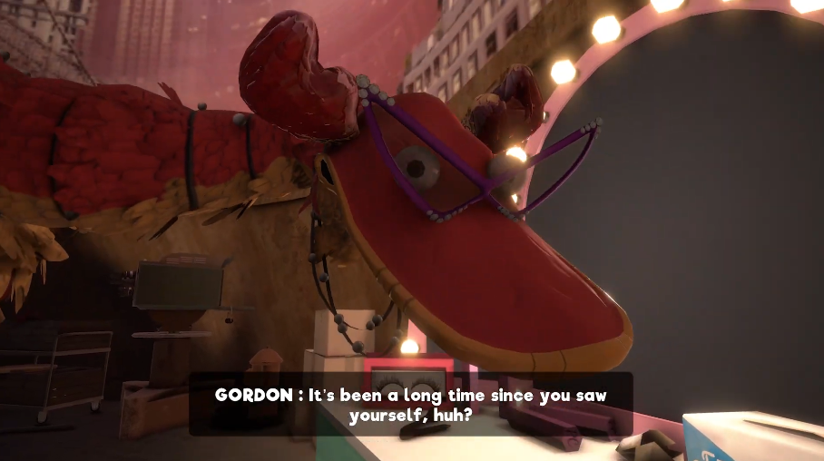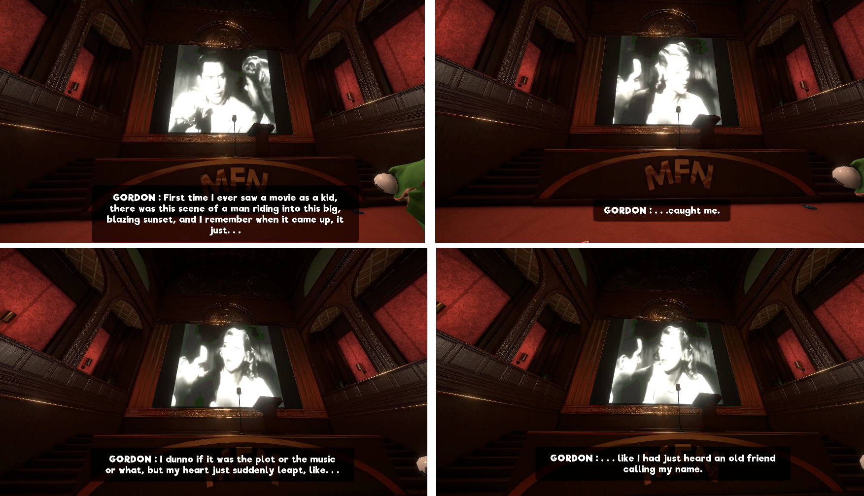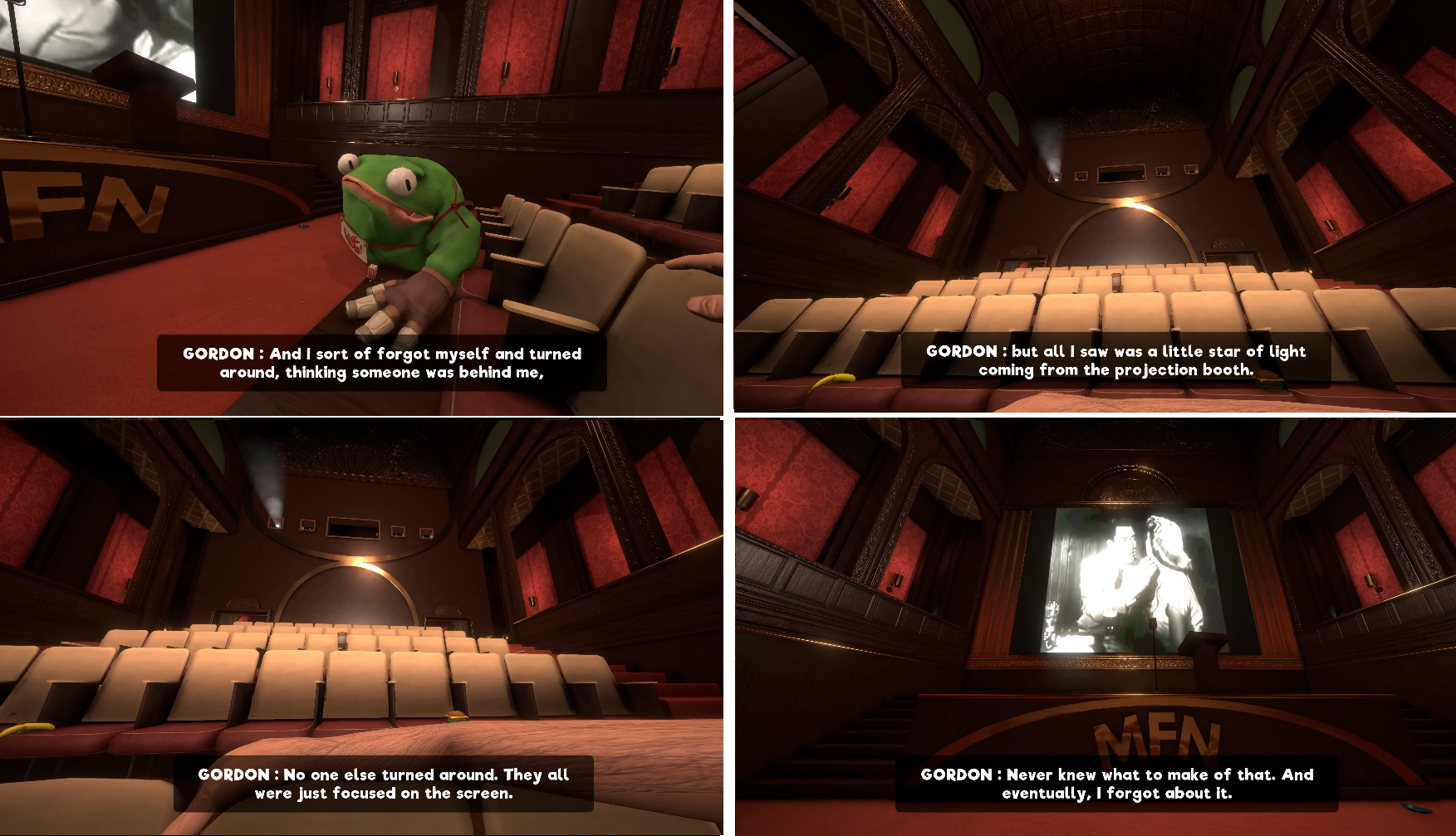 We get a small hint here and there: Gordon says that he was in "the War", and that he has forgotten a lot of the positive moments of his childhood. In a game that tricks you into thinking it's a Five Nights At Freddy's screaming romp of shooting and explosions, it suddenly pulls back into a quiet, emotional moment. Gordon sits down beside a weeping monster puppet in a theater. He seems to be piecing together the theory that these puppets have been watching movie reels, frightening war footage, violent images of a human world they didn't know existed. They thought they were helping children learn in a world that is kind and pure, but they've been left alone, and thrust into horrible knowledge they weren't prepared for, with no one to guide them.