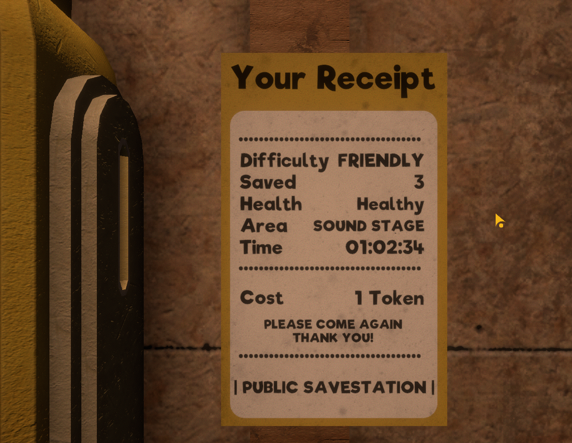 The first instance that really struck me was the save mechanism. Like Resident Evil with its typewriter ribbons (why are they so fragile? Why are they so sparse??), saving in this game is not automatic and not infinite– you pay for every single save (and health refill) with tokens, a limited resource. Save machines ('Public Savestations'--are these a normal thing in this City?) are located in certain safe-rooms sprinkled around the building, and Gordon pops in a token, yanks the slot machine style handle, and a cardboard ticket pops out with an absolutely delicious Chunk-Crunch! Pok! sound.
